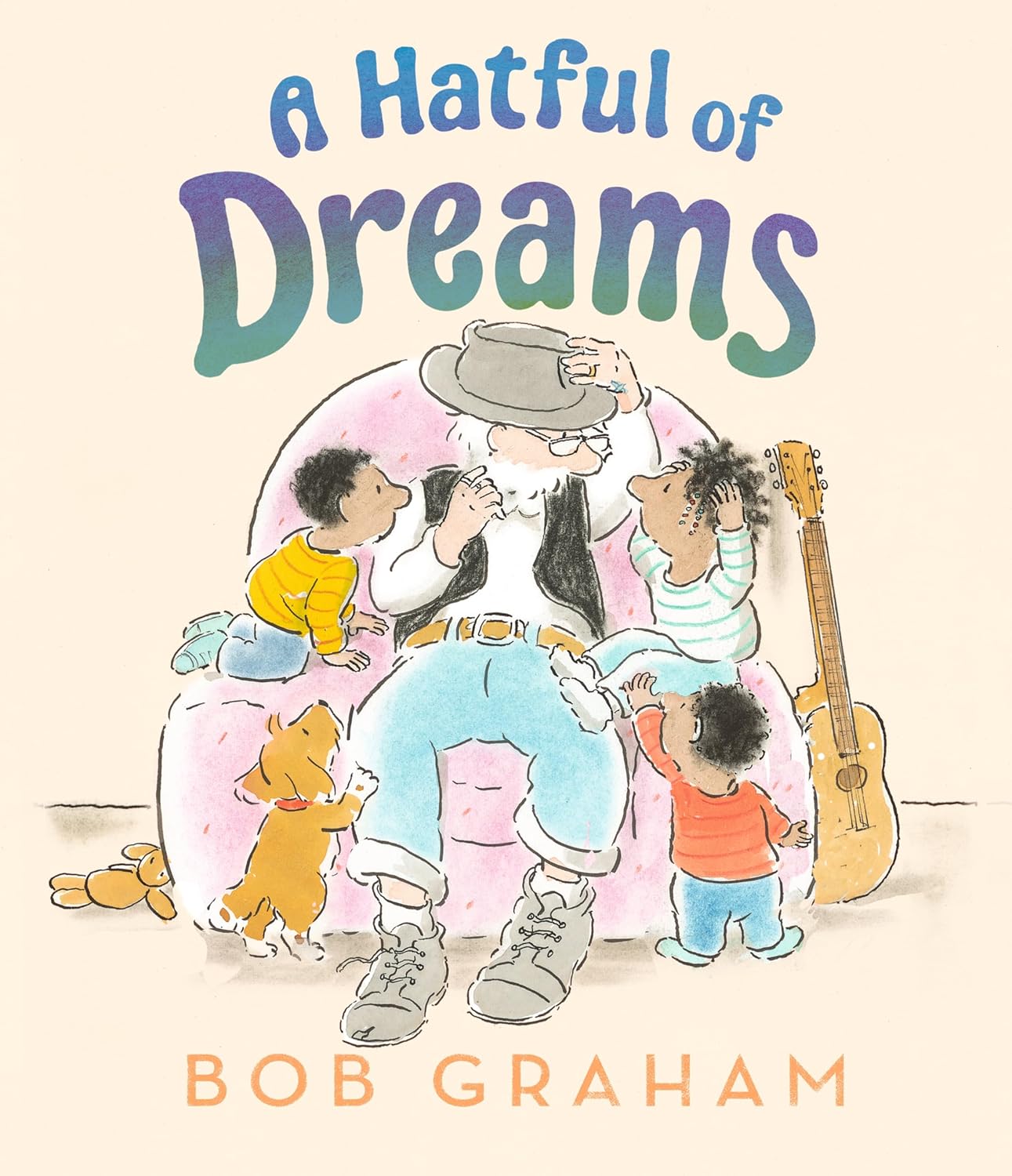 The Mile End Road once sparkled in sunshine and children’s laughter, until hard times came and all the people left, taking with them the sun, moon, and stars. But one family stayed on this broken-down street: the Andersons, in their house with a warm little glow, where kids bounce happily on Dad’s back, and Grandad’s fingers squeak on guitar strings as he jokes about all the secrets and dreams he keeps under his hat. “Grandad, I’ve seen you without your hat,” insists Millie, “and nothing was there except your hair.” But what will the children see the next time he doffs his hat? As always with Bob Graham, the tenderness is in the details: strewn-about stuffies, tumbling children, a blue-jeaned grandad with one leg thrown over his chair arm. It’s a story where even a derelict neighborhood can spark back to life, and where the love of a playfully bantering grandad can conjure a whole universe of light.